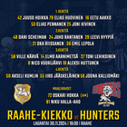Kokoonpano illan Raahe-Kiekko - Porvoon Hunters-otteluun. Kiekko tipahtaa jäähän Raahessa klo18:30