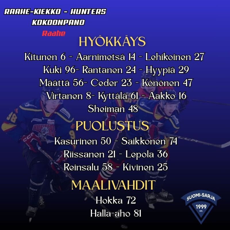 Tänään ei tunteita säästellä, kun Hunters suuntaa kohti Raahea – vastassa vanha tuttu, entinen Hunters-luotsi Siikala ja hänen joukkue Raahe-Kiekko kotikaukalossaan.