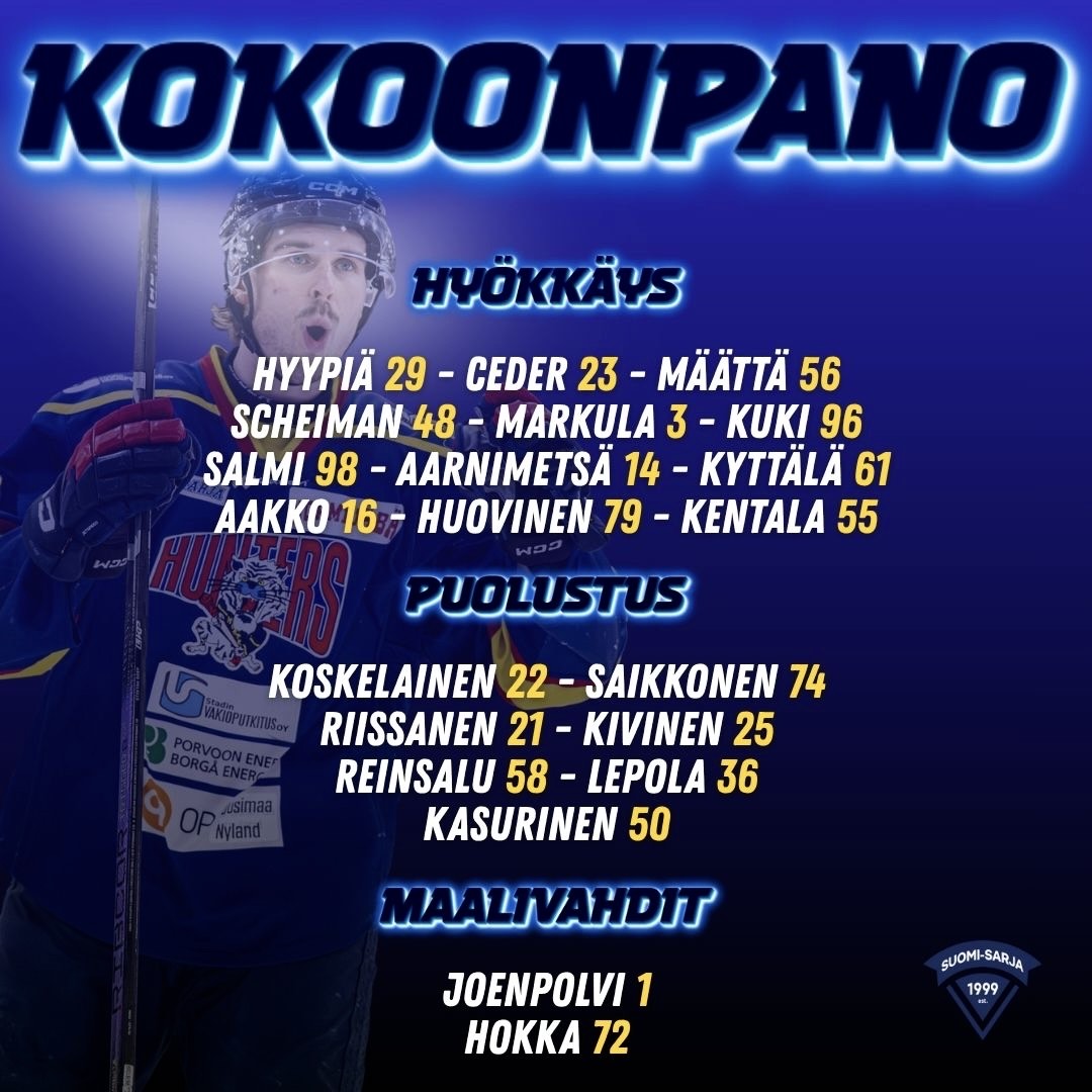 Tänään Hunters isännöi @skiekkoedustus-joukkuetta Seinäjoelta. Ottelusta on luvassa takuuvarmasti kova taisto. Eilen Titaanit ojensivat Karhulassa vastustajaa jatkoaikavoitolla, joten Seinäjoelle halutaan kahmia isompi potti sarjapisteitä tuliaisiksi “etelän veteliltä”. Mutta kuten Porvoossa on nyt näytetty - täältähän ei hevillä heru pisteitä!
