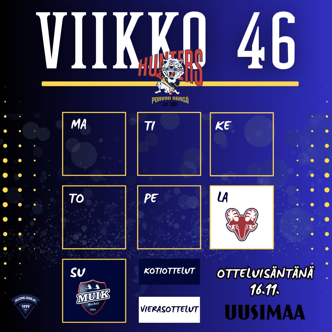 KOTIPELI • Hunters vs. Muik Hockey (Uusikaarlepyy) • Sunnuntaina 16.11. klo 16:00 • Kokonniemen jäähalli, Porvoo