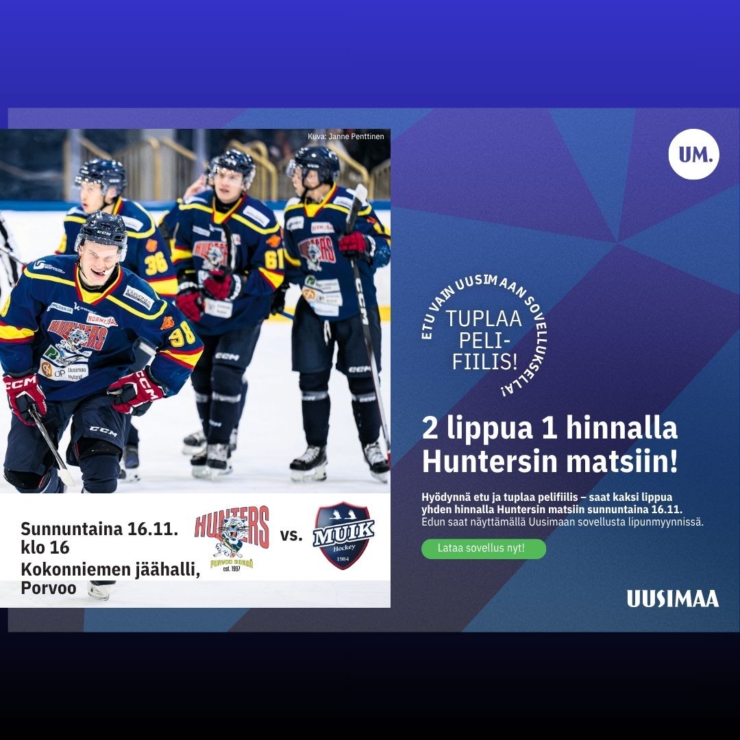 @uusimaafi on Porvoon Huntersin monivuotinen yhteistyökumppani Uusimaan sovellusta lipunmyynnissä näyttämällä saat 2 lippua 1 hinnalla illan otteluun.